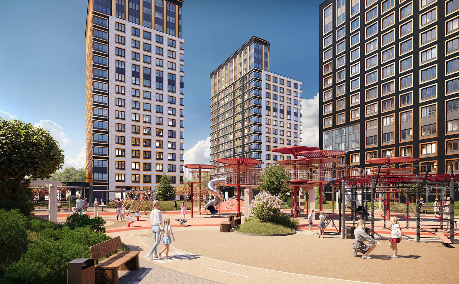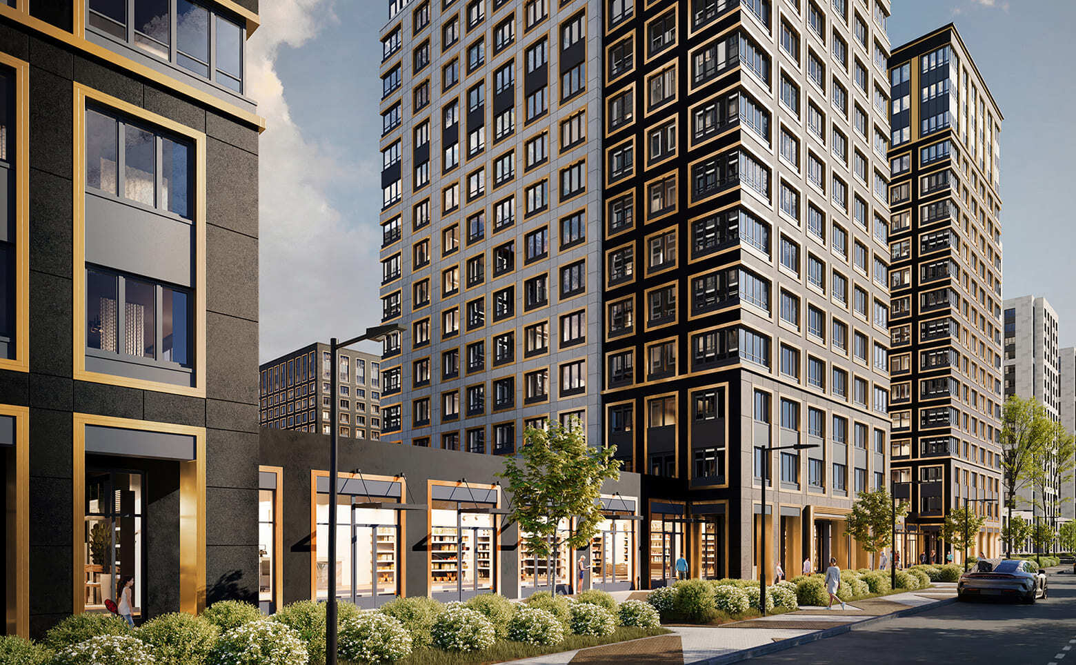 В проекте представлен широкий выбор планировок: студии и квартиры с 1–3 спальнями, в том числе европланировки. Доступны квартиры с кухнями-гостиными, мастер-спальнями, гардеробными и просторными лоджиями. Высота потолков варьируется от 2,74 до 3,04 м. Помещения идут без отделки, в подчистовом или чистовом исполнении — в зависимости от корпуса. Все балконы и лоджии остеклены системой алюминиевых профилей с одинарным стеклом. Возможен дозаказ чистовой отделки.