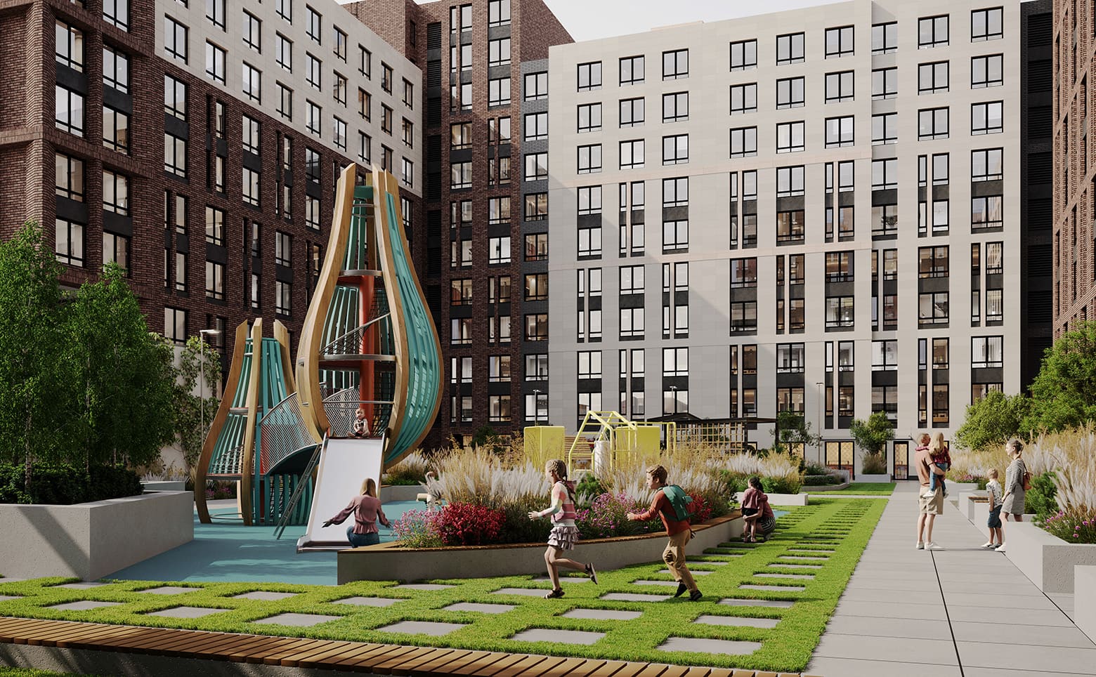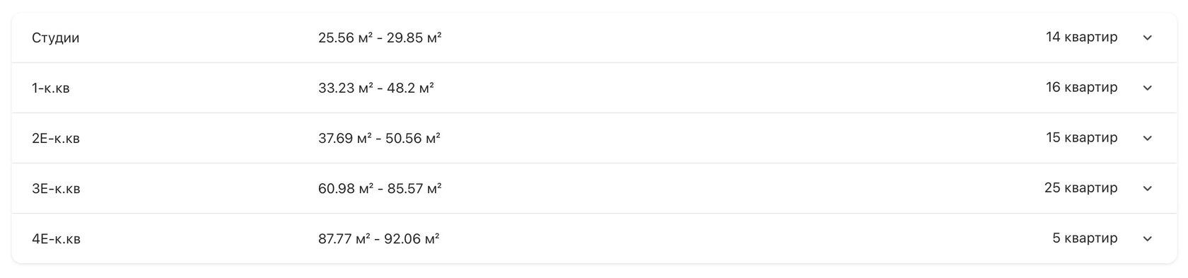 В проекте предусмотрены различные планировочные решения как классического, так и евроформата. В большинстве квартир предусмотрены балконы или лоджии. Квартиры сдаются с подчистовой отделкой, с высотой потолков от 2,88 до 3,05 метров и увеличенными окнами. На первом этаже предлагаются сити-виллы с собственным входом и высотой потолков 3,9 метров.